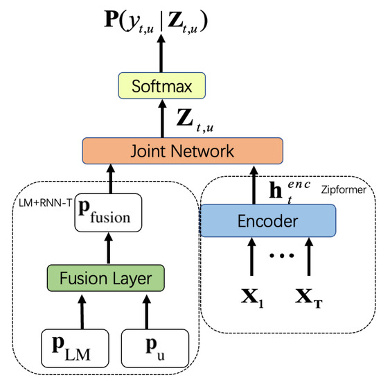 After fusion, the representation is fed into the joint network where it is combined with the acoustic features produced by the Zipformer encoder, resulting in the final output distribution, as illustrated in Equations (9) and (10):