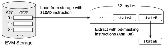 For efficient use of storage space, the Solidity compiler often packs multiple state variables into a single slot of the storage [17]. The EVM storage is a mapping from the integer address to a 32-byte slot, which is large enough to hold multiple state variables. Figure 2 illustrates the layout of the state variables of the previous example in Figure 1. Two state variables (stateA and stateB) of the contract are packed into the same slot of the storage. To read stateB, EVM bytecode has to first load the 32-byte slot stored in storage address 0 and then extract the value of stateB with bit-masking operations.