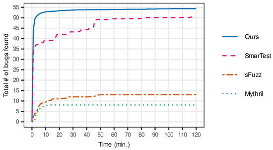 Figure 3 presents the number of bugs found over time, obtained by computing the average over the 40 iterations. The figure indicates that our system not only found more bugs than other tools, but it also triggered the bugs much more promptly than others. Our tool triggered more than 50 bugs after performing fuzzing for 10 min, whereas SmarTest found less than 40 bugs after running symbolic execution for the same amount of time.