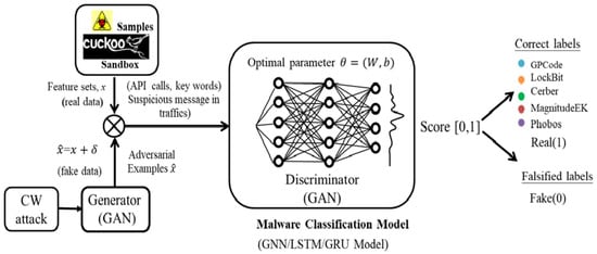 To defend against infections from network viruses, defenders often utilize deep learning-based detection models, including a convolutional neural network (CNN), recurrent neural networks (RNN), long short-term memory network (LSTM), and gated recurrent unit (GRU). In practice, Deep Learning Networks (DLNs) are susceptible to adversarial attacks related to adversarial examples (AEs), where merely altering the sequence of inputted realistic attack commands can lead to misclassification. The adversarial attack poses a significant challenge to deep learning models, especially in the realm of network security, as changing the sequence of input attack commands complicates the classification of malicious software. Among various adversarial techniques, the Carlini and Wagner (CW) attack [9] can generate adversarial examples that deceive models and cause misclassifications at minimal cost due to its sophisticated design framework. The CW attack operates by introducing imperceptible perturbations to input data, effectively manipulating the model’s predictions while maintaining a high degree of stealth. This optimization-based adversarial attack minimizes the perturbation size while maximizing the confidence level of misclassification, making it particularly challenging for existing detection systems to identify and counteract such threats.