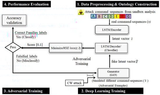 In this study, we develop a sequential data-based DLN model, entitled LSTM-EDadver, that utilizes sandbox (i.e., feature engineering) to extract the malware crucial features for classification and GANs to generate adversarial examples for command sequences associated with Carlini and Wagner (CW) attacks [9] and enhance malware detection capabilities, thereby improving the accuracy of ransomware detection models against evolving threats.