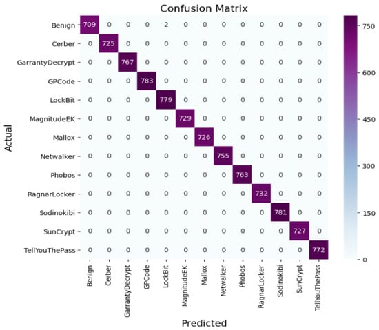 The experimental dataset comprised 718 ransomware samples spanning 12 distinct families, along with 324 normal instances. For classification purposes, we employed the C4.5 decision tree to select the top five features listed in Table 6, thereby optimizing the dataset for class classification. The experimental results reveal that the average accuracy achieved 99.05% and 99.52% through multi-class k-fold validation with k = 7 when using the LSTM model and LSTM-EDadver, respectively, in the classification of ransomware families (as illustrated in Figure 7, Figure 8 and Figure 9 and detailed in Table 8).