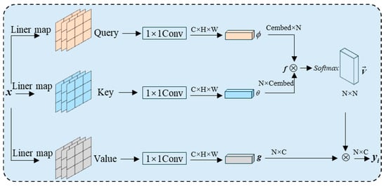 The shape of the input feature is ; after the embedding operation, the feature becomes , where represents the number of channels after embedding. When calculating the relationship matrix, and are, respectively, reshaped into and ; through matrix multiplication, a relationship matrix is obtained, where each element represents the relationship strength between position i and position j.