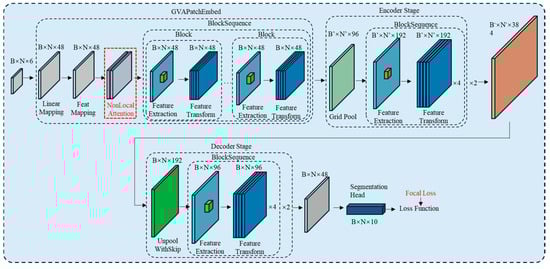 In the architecture of the NF-PTV2 model, the input is a preprocessed point cloud with a shape of , where B represents the size of the Batch size, N is the number of points in the point cloud data, and 6 is the number of feature channels of the point cloud, in the original PTV2 model; the input first passes through the Grouped Vector Attention (GVA) Patch Embed. The linear projection layer fully connects the input point cloud data; then, the point cloud data is sent into the Block Sequence module through the feature projection layer for feature extraction and transformation. There are four Block modules in the Block Sequence module; each Block module contains a feature extraction layer and a feature transformation layer, and among them, the Grouped Vector Attention (GVA) is embedded in the feature extraction layer to extract features. After passing through GVA Patch Embed, the point cloud data are sent to the encoding layer, in the encoding layer, the pooling layer performs down-sampling pooling on the point cloud, and the number of points in the point cloud becomes N′; the number of feature channels of the point cloud becomes 96; immediately afterward, the point cloud undergoes further feature learning through the Block Sequence module; and the number of feature channels of the point cloud then becomes 192. There are two layers in the encoding layer, and in the second encoding layer, the shape of the point cloud is transformed into . In the decoding layer, the point cloud receives the output from the encoding layer, performs de-pooling and up-sampling on the point cloud data, and uses skip connections to concatenate the point cloud features. The de-pooling operation restores the point cloud data, then it is processed by the Block Sequence module again, and the number of feature channels of the point cloud is further reduced to 96; there are two layers in the decoding layer. After the second decoding layer, the shape of the point cloud is transformed into . Finally, the segmentation result of the point cloud is obtained through the segmentation head module. At this time, the shape of the point cloud is , where 10 is the number of feature channels of the point cloud and also represents the number of categories for point cloud segmentation.