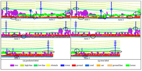 As shown in Table 1, in Area 1, the NF-PTV2 model had relatively high classification accuracies for most of the various labels. Specifically, the classification accuracies of “ground”, “ground line”, “high line”, “house”, “low line”, “tower”, and “tree” were all as high as over 90%. However, the classification accuracies of “car” and “obstacle” were relatively low. In the classification of car point clouds, more than half of the point clouds were incorrectly classified into other category labels. Among them, a relatively large proportion of point clouds were misclassified as road category, with 5357 car point clouds being misclassified as road point clouds, accounting for as high as 33% of them. In the classification of obstacle point clouds, 25.63% of the point clouds were misclassified into other category labels. Among them, a relatively large proportion of point clouds were misclassified as road category as well, with 3958 obstacle point clouds being misclassified as road point clouds, accounting for as high as 23.43% of them. Although the classification accuracies of obstacle point clouds and car point clouds were relatively low, their proportions in the distribution network point clouds were very small. Therefore, their classification accuracies have a relatively minor impact on the overall classification accuracy of the distribution network point clouds.