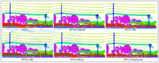 As shown in Table 2, the performance of the Non-Local attention in the classification of distribution network point clouds was far ahead of that of other attention mechanisms. The model embedded with the Non-Local attention mechanism had achieved higher accuracies than other models in terms of the three metrics, namely Overall Accuracy (OA), mean Accuracy (mAcc), and mean Intersection over Union (mIoU), and also had higher accuracies than the original PTV2 model. In order to demonstrate the performance of models with added attention mechanisms visually, the segmentation results of each model on the distribution network point cloud dataset are shown in Figure 4.