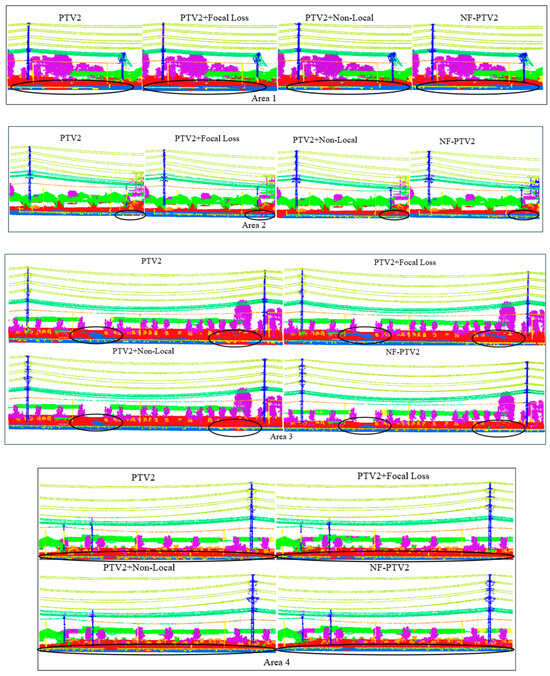 In order to explore the impact of the embedded attention mechanism and loss function on the model performance in more detail, the performances of the original model (PTV2) and the improved models (PTV2 + Focal Loss, PTV2 + Non-Local, NF-PTV2) on the distribution network point cloud dataset are presented and compared through visualization, respectively, as shown in Figure 5.