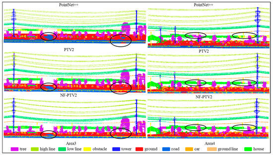 In Area 1 and Area 3, it was observed that the NF-PTV2 model incorrectly predicted some line point clouds near the poles and towers as pole and tower point clouds. This might be attributed to the fact that at the intersection of towers and lines, the point clouds of these two elements merged to some extent, which consequently led to insufficient feature recognition by the model at the intersection area.
