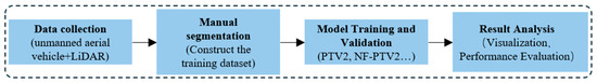 To further illustrate the overall structure of this study, Figure 7 presents the specific workflow. Firstly, airborne LiDAR mounted on a drone is utilized to collect point cloud data from the target area. Subsequently, the training dataset required for model development is constructed through manual segmentation. The improved models are then trained and validated on this dataset. Finally, visualization techniques and performance evaluation are employed to demonstrate the superior performance of the proposed models.