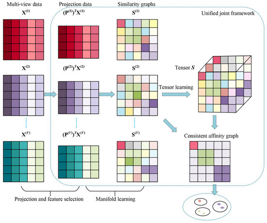 High-order information among different views can be captured by tensors. The existing tensor-based methods do not consider redundant information, and most of them do not directly obtain clustering results during optimization but use other clustering algorithms subsequently, such as K-means or spectral clustering, to obtain the results. In order to perform feature selection and structure preservation in a unified framework and capture both complementary and higher-order information without subsequent steps to obtain clustering results, this study proposes a brand-new MVC approach called tensor-based unified and discrete multi-view projection clustering (TUDMPC). As depicted in Figure 1, the approach uses projection to learn low-dimensional spatial features and uses the -norm for feature selection to eliminate the effects of redundancy and noise. Meanwhile, the divergence between similar graphs is minimized by a tensor kernel norm to better utilize the high-order correlations and complementary information of related graphs with different views. In addition, the Laplace rank constraints are imposed to ensure that the affinity graphs have discrete cluster structures and that the clustering results are obtained directly in a unified framework. This work makes the following major contributions: