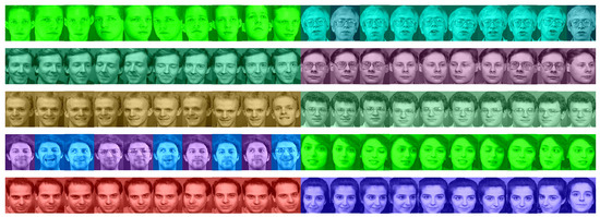 The visual recognition results of TUDMPC for the first 100 face images of the ORL dataset are presented in Figure 9, where images in the same cluster are identified by the same color. As Figure 9 shows, TUDMPC misclassified only two groups of face images, i.e., images 12 and 20 of the first row and images 1, 4, 5, 7 and 9 of the fourth row, out of the 10 groups of face images presented, and classified the rest of the groups correctly. Thus, the face image recognition performance of TUDMPC is satisfactory.