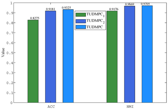 The performances measured in ACC and NMI of the TUDMPC, TUDMPC1 and TUDMPC2 on the 100leaves dataset are given in Figure 11. From the figure, the projection learning and the tensor learning can be seen to facilitate MVC. Especially, projection learning can significantly enhance the clustering performance by capturing the structure of the data in a low-dimensional space free of noise and redundant data.