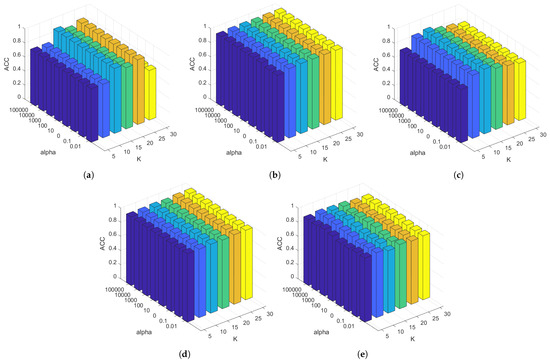 The objective function (7) of the TUDMPC has three parameters, i.e., , and , that need to be determined. According to (23), the search for an optimal value of is transformed to the search for the optimal value of k. Therefore, the sensitivity of the clustering performance of TUDMPC when changes can be analyzed when k changes. The value of k is empirically chosen from the interval [5,30]. It is challenging for the clustering method to find the best values for for all datasets because different datasets have distinct properties. Therefore, this study uses grid search to find the best values of the regularization parameter from the set . Simultaneously, according to Sang et al. [22], the value of is set according to (30) in the following,