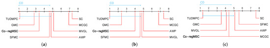 From the results in Figure 14, the performance of TUDMPC is statistically different from those of SC, MVGL, MCGC and AWP in ACC and NMI, and statistically different from those of SC, SFMC and AWP in purity. The above statistical test results show that TUDMPC outperforms the baseline methods.