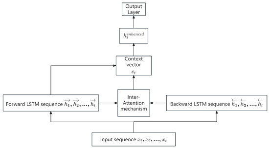 By incorporating the Inter-Attention Mechanism into BiLSTM, the forward and backward LSTMs can mutually attend to each other’s hidden states at each time step, enabling the capture of richer bidirectional information. A trainable feedforward network is used to compute the similarity scores, enhancing the model’s representational capacity. The context vector , which summarizes the global information from the counterpart LSTM, aids in making more accurate predictions at the current time step. Figure 1 illustrates the IAM-BiLSTM prediction model.