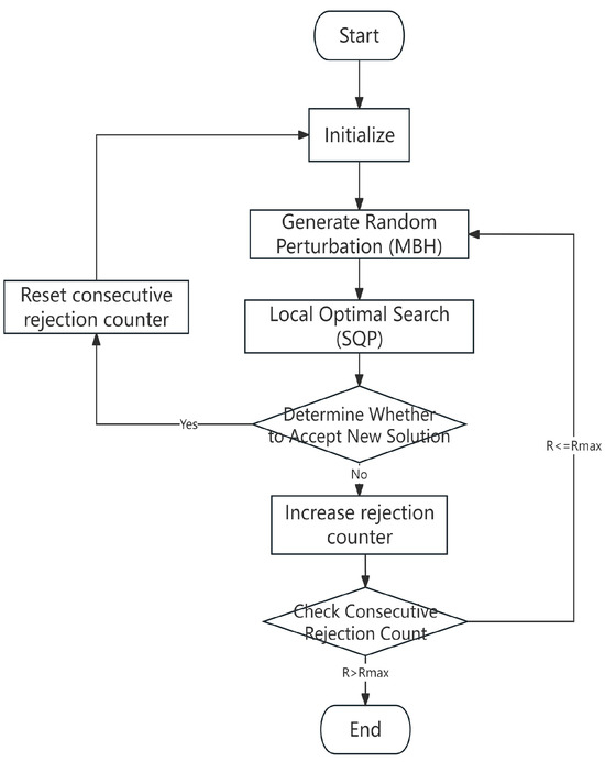 Although the MBH algorithm can help find the global optimum or near-optimal solutions, there is still the risk of getting stuck in local optima. Therefore, it is combined with the SQP algorithm. SQP has weak global search capabilities but strong local search capabilities, allowing it to converge to local extrema in a short time. By combining them, their strengths can complement each other. The integration of Sequential Quadratic Programming (SQP) and Monotone Basin Hopping (MBH) algorithms provides a comprehensive optimization method that combines both global and local search capabilities, known as the Comprehensive Search Algorithm (CSA), as shown in Figure 2. Its detailed steps are outlined in Table 4.