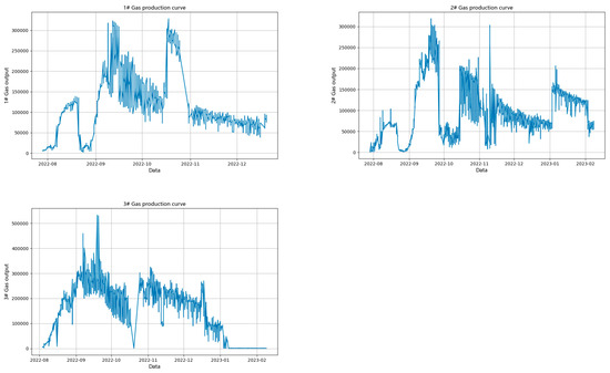 Based on the operating conditions of ground equipment and production equipment at a specific oil well site in Sichuan, the experimental data used consists of historical dynamic liquid level data collected on-site from three oil wells during 2021–2022. To enhance the generalization ability of the model, 1000 data points were randomly selected from each well to construct the dataset. Each dataset corresponds to dynamic liquid level data measured over a month for a specific well. The production variations for the three wells are shown in Figure 4 [34]. The standard deviation and variance reflect the fluctuation of a dataset, while the mean, minimum, and maximum values indicate the differences in production among the wells [35]. The standard deviation, minimum, and maximum values of the oil well production data are listed in Table 6. This dataset can be used to validate the proposed model’s performance in predicting wells with significant production disparities.