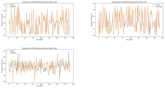 To verify the effectiveness of the proposed IAM-BiLSTM prediction model in the field of oil well production prediction, as well as the improvement in prediction accuracy brought by the Inter-Attention Mechanism to the BiLSTM model, production prediction models were established based on the aforementioned dataset and model parameters. The results of predicting oil well production using the IAM-BiLSTM prediction model are shown in Figure 5.
