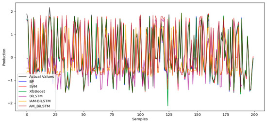 In Figure 6, the black curve (Actual Values) shows how the true data fluctuates frequently across 200 samples. The colored curves represent predictions by various models (BP, SVM, XGBoost, BiLSTM, IAM-BiLSTM, and AM_BiLSTM), all generally following the data’s oscillatory pattern. However, the IAM-BiLSTM model captures sharp peaks and troughs more accurately, demonstrating superior predictive performance compared to the other methods. Although AM_BiLSTM also tracks rapid changes relatively well, methods such as BP, SVM, and XGBoost display more noticeable deviations from the actual values.