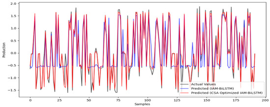 To further validate the optimization capability of CSA for the IAM-BiLSTM prediction model, the CSA-optimized IAM-BiLSTM prediction model was established using the aforementioned production historical data as the dataset. CSA was utilized to optimize the learning rate and feature dimensions of the IAM-BiLSTM prediction model, with specific parameters shown in Table 10. The prediction results are illustrated in Figure 8, and the prediction accuracy comparison results are presented in Table 11. As shown in Table 11, the MAE and MSE of the CSA-optimized IAM-BiLSTM prediction model are 0.0795 and 0.0123, respectively. Compared to IAM-BiLSTM, prediction accuracy has been improved. It can be concluded that optimizing the learning rate, batch size, and the number of neurons in the IAM-BiLSTM prediction model using CSA can effectively enhance the model’s prediction accuracy.