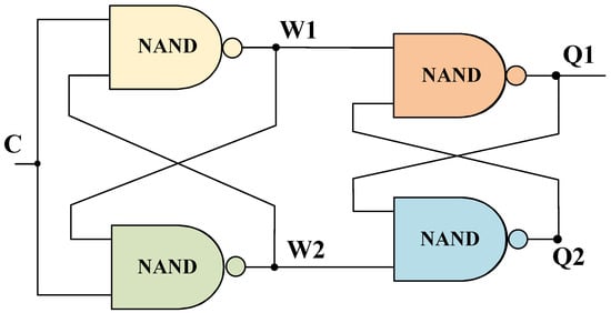 - When the input challenge signal C is “1”, the circuit enters a different operating state. In this case, the DL-PUF unit generates a response using the physical variation from the former cross-coupled circuit. The former cross-coupled circuit enters a metastable state because both inputs are locked to “1”. The two NAND gates of the former cross-coupled circuit could be seen as two cross-coupled inverters, which is similar to an SRAM. According to the internal random difference within the circuit, its output, which is unpredictable, is “0” or “1”; . The latter cross-coupled circuit transmits the response of the former cross-coupled circuit to the output of the unit. The latter cross-coupled circuit outputs the opposite of at the Q1 port, which is either “1” or “0” depending on the metastable state. The latter latch could be considered to work as a two-bit inverter to process the response of the former latch. It does not matter that the response is subjected to a negation logic operation because it retains its randomness.