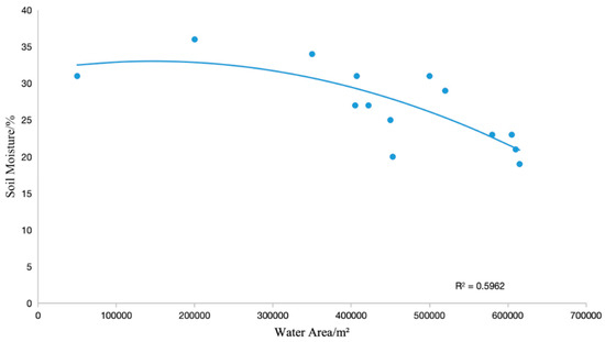 The goodness of fit () is commonly used to measure the correlation between two variables. In this study, the effectiveness of surface water area on soil moisture inversion is estimated by calculating the correlation coefficient. When the correlation coefficient between surface water area and soil moisture is positive, it indicates a positive correlation between the two, and vice versa for a negative correlation. Furthermore, the larger the value, the stronger the correlation between the two. Regression analysis was performed using the surface water area data in Ningxia Province extracted by DCU-Net and the measured soil moisture data at a depth of 20 cm below the surface during the same period, with the results shown in Figure 3. The goodness of fit between the surface water area and soil moisture in the Ningxia region is 0.5962, indicating a strong correlation.