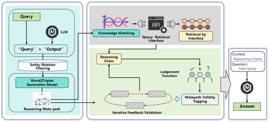 Proposed framework flowchart for DKGM-path. The query will first generate a series of metapaths to support the querying of the knowledge graph and guide the generation of reasoning chains throughout the iterative reasoning steps.
