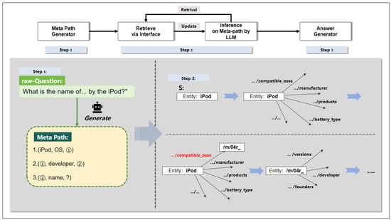 Based on the generated knowledge reasoning metapaths, the method adopts an iterative “retrieve-reason” framework to support the reasoning of large language models on structured data. This framework collects reasoning evidence from structured knowledge graphs through interface calls (i.e., retrieval) and enables large language models to reason and solve user requirements based on the collected information (i.e., reasoning). It supports large language models in iteratively reasoning toward structured data with the help of external interfaces, gradually approaching the target of the given reasoning task query.