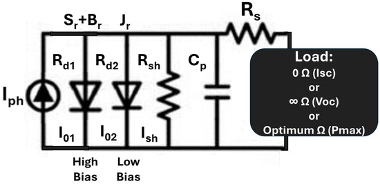 Equivalent circuit of a two-diode model with junction recombination (Jr) along with conventional surface recombination (Sr) and bulk recombination (Br).