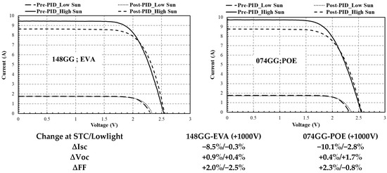 Figure 4 presents pre-PID and post-PID I–V data for two four-cell modules measured at high/STC and low irradiance levels. A table within the figure summarizes the changes in Isc, Voc, and FF caused by PID stress. The data indicate that Isc is the most significantly affected parameter in both modules, with little or no impact on Voc and FF. The table in Figure 4 shows that, despite a significant reduction in short-circuit current (Isc) in both modules (e.g., −8.5% for EVA and −10.1% for POE at STC), Voc exhibits only minor variations (+0.9% for EVA and +0.4% for POE). This suggests that the dominant degradation mechanisms, such as surface and junction recombination, primarily affect carrier collection rather than the built-in junction potential. Prior studies indicate that Voc remains stable in PID as long as shunt pathways do not severely impact the depletion region [3].