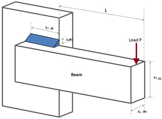 The optimization of a welded beam design involves finding the optimal dimensions of structural elements to minimize production costs while simultaneously meeting the specified strength and geometric constraints, as illustrated in the diagram (Figure 1), where the key variable names are highlighted [9,10,11].