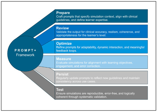 - Simulations undergo systematic validation to confirm functionality, reliability, and reproducibility. Prompts must consistently generate coherent outputs, flag errors, and maintain logical integrity across repeated use.+: In order to help users responsibly apply the framework, the “+” component introduces a pivotal dimension of reflection rooted in the principle of primum non nocere—first, do no harm [18,19]. This addition calls for a deliberate examination of the ethical and practical implications of AI-generated simulations, fostering a culture of accountability and thoughtful introspection. By encouraging users to question the rationale behind AI outputs and creating opportunities for learners to critically evaluate their decisions, this stage ensures that simulations transcend mere clinical accuracy embedded in the full range of human experience.