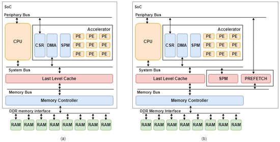 A typical accelerator-based SoC architecture is depicted in Figure 2a. The base architecture consists of a CPU, an accelerator, and a shared LLC that is accessible by both the core and the accelerator. This architecture utilizes several layers of the memory hierarchy. Random-access memory (RAM), serving as the main memory, consists of large but relatively slow DRAM. The LLC is built with SRAM and offers faster access times compared to RAM. The accelerator incorporates its own SRAM in the form of SPM, which offers even faster access times compared to the LLC.