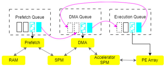 Once the data are transferred to the accelerator SPM, they are appended to the execution queue. Upon completion of data execution, the input data in the accelerator SPM are marked as available space for subsequent use. The executed data are stored in accelerator SPM, and a new request is included in the DMA queue.