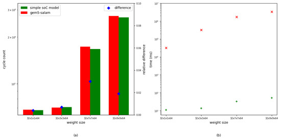 A similar experiment was conducted, maintaining a fixed input size while varying the dimensions of the weight matrices. The total number of cycles required for convolution computation, along with the relative differences in measurements between the two models, are presented in Figure 5a. As iseen in the figure, the relative difference was smaller than 3%. Additionally, Figure 5b illustrates the required time for runtime execution. As shown in the figure, the simulation time of gem5-SALAM increases approximately with the same increase ratio in weight sizes. On the other hand, the increase in the simulation time is trending less than the increase in the number of weights for the simple SoC model. For instance, for a weight size of 9 × 9, the simple SoC model demonstrates a speedup of approximately 64,000 times compared to the gem5-SALAM simulator. Furthermore, it is noteworthy that modifying the system parameters in gem5-SALAM entails an additional 4 h of execution time.