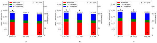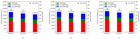 Energy and performance comparison: LLC-based SoC vs. SPM usage for Darknet-53 (a) 2 MB Cache vs. 1 MB SPM (b) 1.5 MB Cache vs. 0.75 MB SPM (c) 1 MB Cache vs. 0.5 MB SPM.
