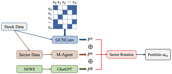 - Data fusion and sector rotation layer. This module is a reinforcement learning framework that relies on graph convolution. It follows the first two modules, incorporating residual structures and assimilating the initial stock time-series data X, utilizing outcomes from and . Subsequently, the optimal portfolio management scenario is determined via reinforcement learning after data fusion. The process of this method is illustrated in Figure 1, showing the three modules mentioned previously by matrix addition ⊕. The input stock time-series data are processed through these modules to derive the final portfolio management results.