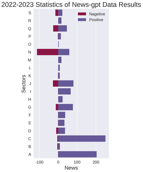 After conducting the experiment, we monitored the output of the news sentiment analysis module. We present the results in this section in advance because, as illustrated in Figure 3, the majority of news in most sectors displayed a positive sentiment. This phenomenon can be attributed to a common bias in news reporting, whereby positive news is favored and negative news is suppressed [41]. Although this issue is unavoidable, its impact can be mitigated by implementing corrective measures. In this experiment, we sought to increase the weight of negative news in the data by altering the value of −1 assigned to negative news in Equation (8) to a higher magnitude.