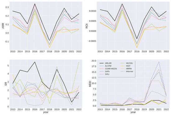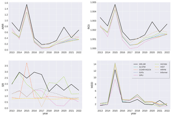 Figure 4 and Figure 5 present the 10-year experimental results of all algorithms on the Chinese and US markets, while Table 3 provides detailed information on the 2022 results. For the ARR, SR, and ROI, the higher the value, the better, while for MDD, the lower the value, the better. From the figure, it is evident that DRLSR significantly outperforms the other algorithms in terms of the ARR and ROI. In this study, the ARR indicator is considered the most important since it can directly reflect the learning ability of algorithms. As introduced in Section 3.2, the ROI is the average daily actual return of the managed portfolio, which can be regarded as the daily refinement of the ARR. Thus, the trends in ROI and ARR are similar. Moreover, the SR and MDD reflect the risk of the managed portfolio. The calculation of SR incorporates variance, resulting in substantial deviations among the different algorithms. Since this study did not include specific risk control, this is acceptable for the portfolio risk of DRLSR based on the results, and it still show a slight improvement over the other algorithms regarding these two indicators.