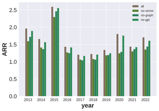The furthest left bar in the clusters in Figure 6 indicates the model including all modules, while the other three, from left to right, present ablation experiments without the sector trend prediction layer, without the sector rotation layer, and without the news sentiment analysis layer, respectively. The experimental results reveal that each module has a positive impact on the method in terms of the ARR. The sector rotation layer and sector trend prediction layer contribute more significantly to the overall model than the news sentiment analysis module. This is not due to the low-accuracy results of the large language model for news data analysis. We found many studies in the field of quantitative investment that introduce textual data that suffer from survivorship bias [49]. For example, in certain stock market forums, a notable portion of participants only share their feedback when they have suffered losses. Correspondingly, in the arena of stock-related news, owing to the sway of government policies, media outlets often portray news favorably, culminating in issues of impartiality in these textual data. Nevertheless, after adjusting the weight of negative news (as outlined in Section 3.6), the news data module continued to exert a positive influence on the model, albeit to a lesser extent than the other two modules.