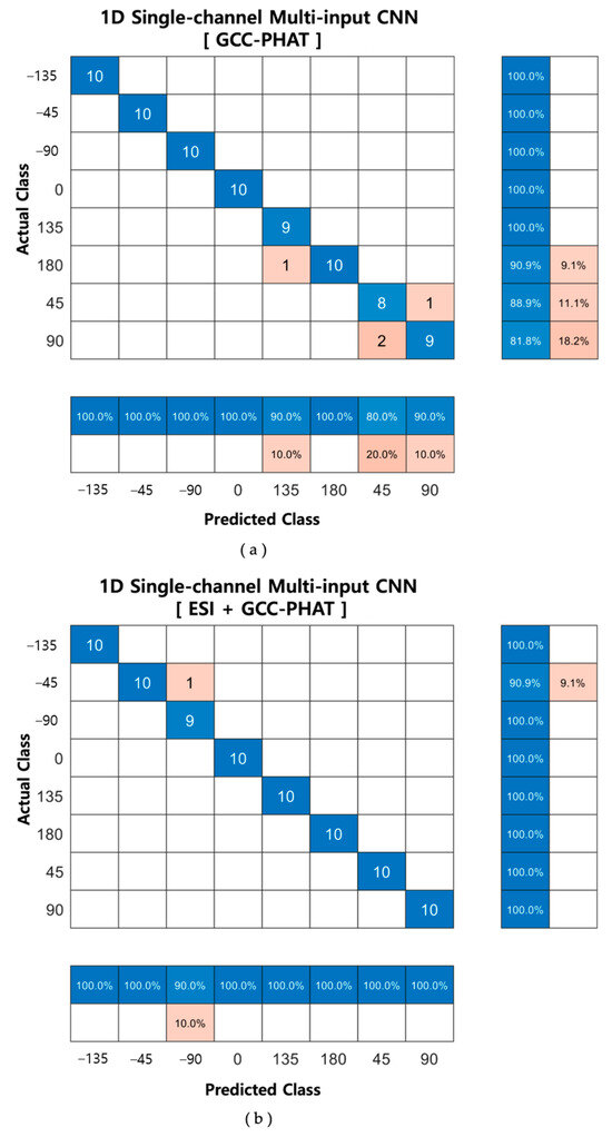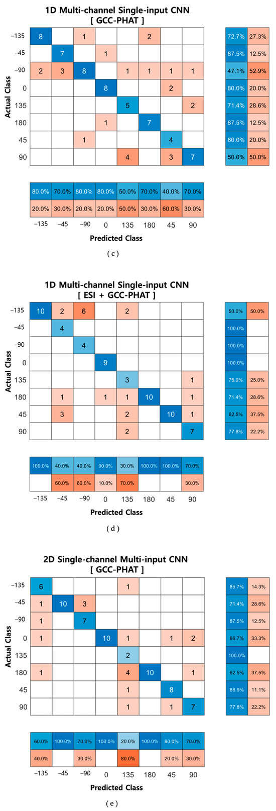Confusion matrices of each method: (a) input: GCC-PHAT, Network: 1D single-channel multi-input CNN; (b) input: ESI + GCC-PHAT, Network: 1D single-channel multi-input CNN; (c) input: GCC-PHAT, Network: 1D multi-channel single-input CNN; (d) input: ESI + GCC-PHAT, Network: 1D multi-channel single-input CNN; (e) input: GCC-PHAT, Network: 2D single-channel multi-input CNN; (f) input: ESI + GCC-PHAT, Network: 2D single-channel multi-input CNN; (g) input: GCC-PHAT, Network: 2D multi-channel single-input CNN; (h) input: ESI + GCC-PHAT, Network: 2D multi-channel single-input CNN.