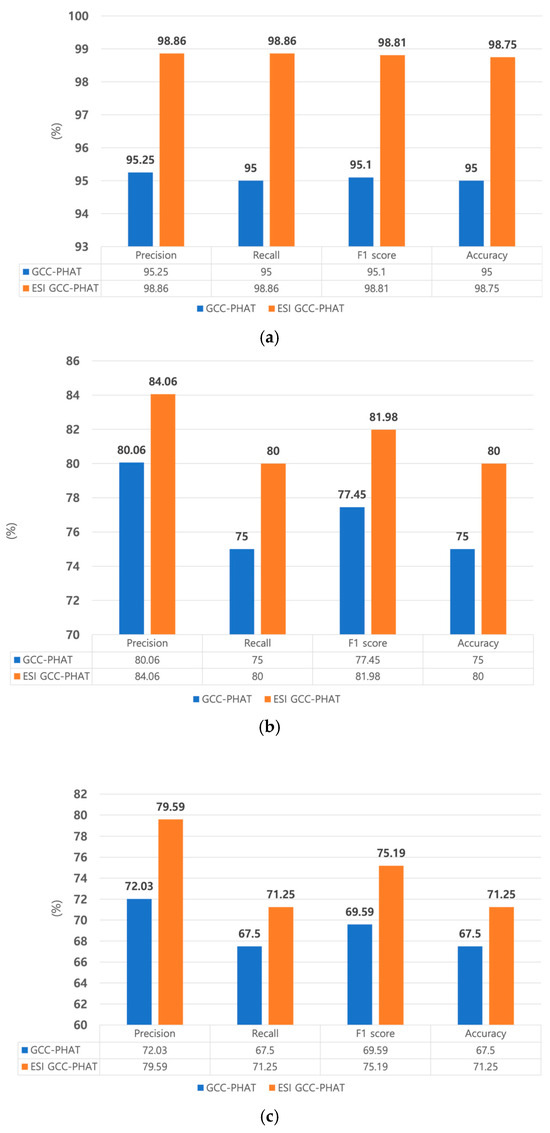 By comparing the confusion matrix for various methods, we confirmed that the highest accuracies were estimated when GCC-PHAT was extracted from the original signal and when it was extracted from the ESI and used as input to the 1D multi-channel input CNN. In addition, when comparing the two methods, the proposed method classified the location more accurately than the existing method. As indicated in Table 5 and Figure 16, extracting GCC-PHAT from the ESI and using it as input to the two networks led to better performance than extracting only GCC-PHAT from the original speech and using it as the input, in terms of accuracy, precision, recall, and F1 score. These results also indicate that ESI extraction is an essential step in sound source location tracking. In addition, of the two types of networks, the one using 1D input showed higher accuracies of 98.75% and 71.25% with a shorter learning time, and the proposed single-channel input CNN showed high accuracy regardless of the dimension of the input signal. In conclusion, we proved that the ESI GCC-PHAT method with the ID single-channel multi-input CNN network is the most suitable method. Also, to check whether the difference between the accuracy values of the one-dimensional, single-channel multi-input method and multi-channel single-input method models based on the ESI + GCC-PHAT input values is significant, we performed a t-test. The p-value is significant with a value of p < 0.001.
