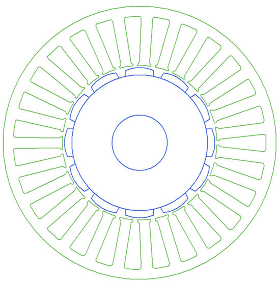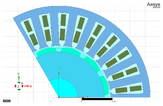 The design results were transferred to the “Maxwell 2D” analysis module for detailed analysis. As can be seen from Table 1, the control type is AC. No changes have been made to this transfer. So, the motor drive technique has been adjusted to voltage-fed. As seen in Figure 4, a symmetric component of the motor geometry was considered in “Maxwell 2D” to reduce the analysis time.
