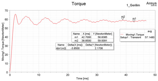 In Figure 5, the torque has stabilized over time, and as a result, the expected torque value from the motor has been closely achieved. This figure shows the time on the x-axis in milliseconds [ms] and the torque values on the y-axis in NewtonMeter [Nm]. The variation in torque over time and torque ripple can be observed in this graph. Here, the reference motor exhibits a torque ripple of 2.17 Nm and a torque amplitude of 57.92 Nm.