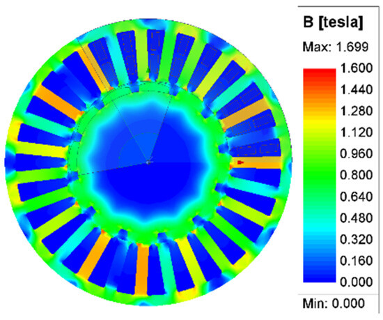 In Figure 7, the distribution of magnetic flux density is shown, and it can be observed that the magnetic material is not in the saturation region.