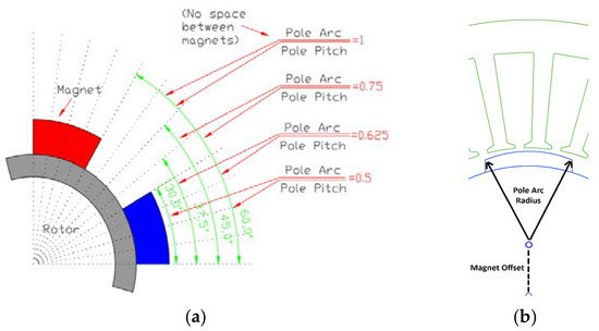 To investigate and improve the torque ripple of the reference servo motor, alternative designs were developed through design and analysis activities. These designs were achieved by altering the magnet geometry. Changes were made to the geometry using the parameters of magnet offset and magnet width (see Figure 10).