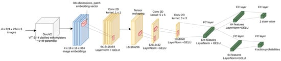 The methodology utilized the Proximal Policy Optimization (PPO) algorithm with key hyperparameters, including a learning rate of 4 × 10−4, batch size of 1024 × 3, and a discount factor of 0.99. Linear decay was applied to stabilize training. Vision Transformers (ViTs), specifically the DinoV2 model, were integrated as replacements for CNNs such as ResNet34. DinoV2 embeddings were compressed to optimize reinforcement learning tasks, resulting in improved efficiency and performance.