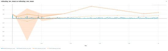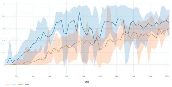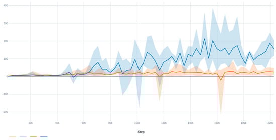 From multiple hyperparameter tuning experiments, the averaged graphs (Figure 8 and Figure 9) show key performance trends. Figure 8 illustrates how, as training progresses, the model learns to approximate the expected return from the environment, reducing errors and improving its ability to generalize from experience. Similarly, Figure 9 shows the mean episode reward increasing over training steps because the model’s improved generalization enables it to learn better driving strategies, leading to higher rewards. All models in these graphs were trained for 200,000 frames on a map with curved road segments. The blue line represents DinoV2-based models, and the yellow line shows ResNet34-based models. On average, the ViT-based models achieved higher rewards, and the difference in performance grew with training. The PPO algorithm also seemed to evaluate the agent’s state more effectively and faster when using the Vision Transformer, further proving its advantage over CNN-based models.