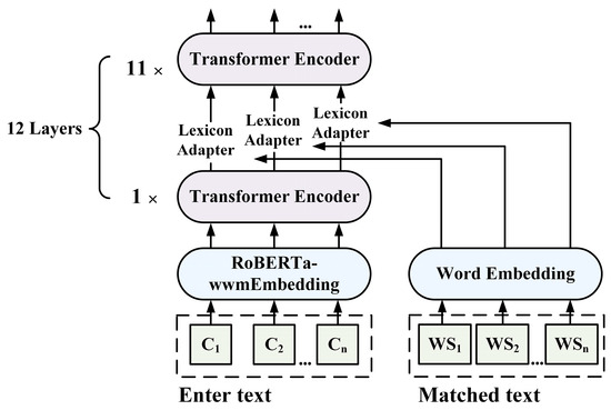 The structure of the LE-RoBERTa-wwm model is shown in Figure 2, which, compared to the RoBERTa-wwm-ext model, mainly adds two key mechanisms [21]. Firstly, the input text is matched with the specialized lexicon in the railway domain to convert the track circuit O&M text data into char–words pair sequences, and secondly, the lexicon adapter module is utilized to integrate the char–words pair sequences efficiently into the underlying coding of the RoBERTa-wwm-ext model.
