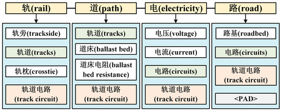 As shown in Figure 3, given a sentence “轨道电路 (English name: track circuit)”, it can be expressed as a single character as follows: . For each character “轨 (English name: rail)”,“道 (English name: path)”,“电 (English name: electricity)”, and “路 (English name: road)”, the Trie tree can be queried to find all the potential words in the sentence, which are as follows: “轨旁 (English name: trackside)”,“轨道 (English name: tracks)”, “轨枕 (English name: crosstie)”,“道床 (English name: ballast bed)”,“道床电阻 (English name: ballast bed resistance)”,“电压 (English name: voltage)”,“电流 (English name: current)”,“电路 (English name: circuits)”, and “路基 (English name: roadbed)”. Inputting a single character can be matched to potential word combinations in the specialized domain Trie tree, so that the corresponding char–words pair sequence can be constructed: .